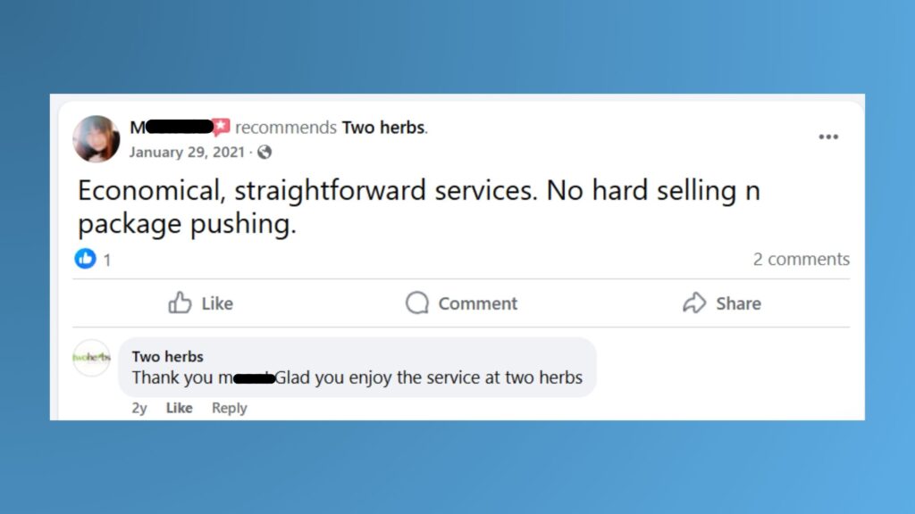 Two Herbs is a local Singapore brand focused purely on herbal scalp care. Their services are 100% herbal and completely chemical-free that targets common or everyday scalp issues. They pride themselves on using natural ingredients you can trust.